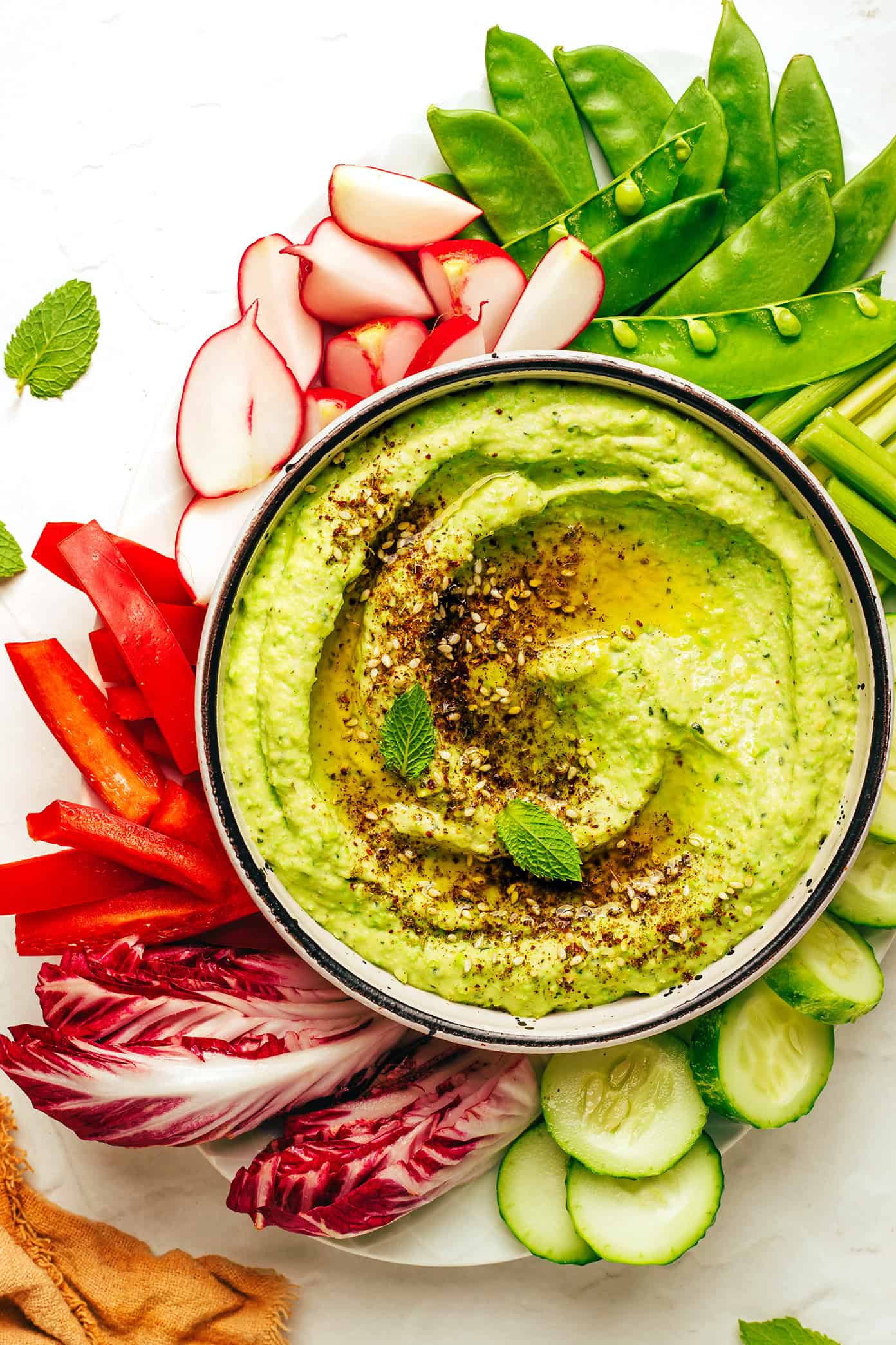 This mint pea hummus recipe is easy to make in 10 minutes and perfectly balanced with sweet and savory flavors.