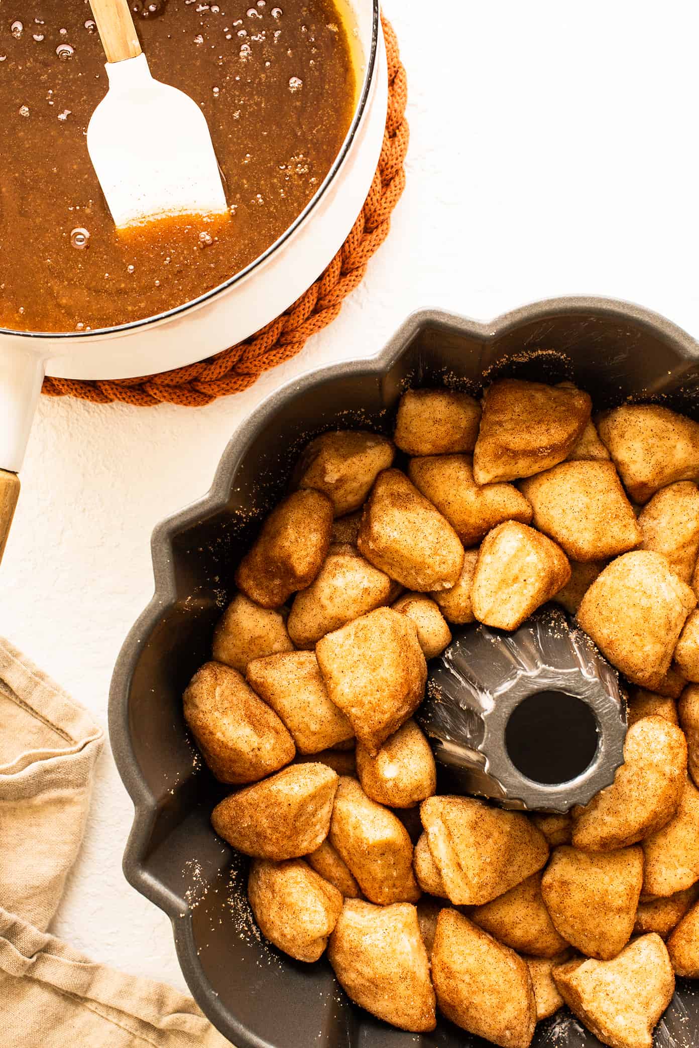 - Use a bundt pan.ย There’s a reason that monkey bread is traditionally made in bundt or tube pans. The design of the pan allows the biscuits to cook evenly (avoiding an undercooked center) and ensures extra gooey, caramelized eges.