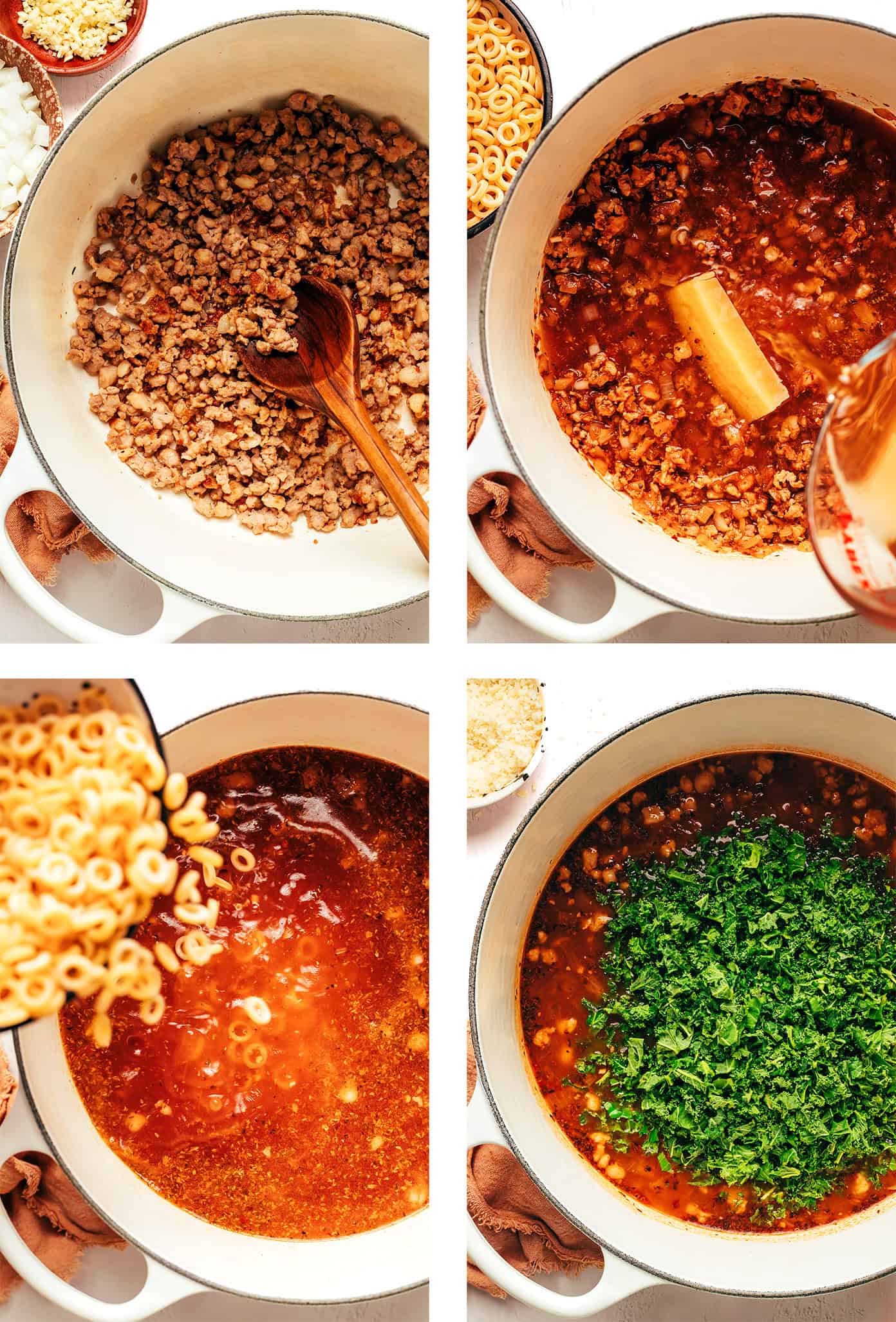 Itโs super easy to make in around 30 minutes with a simple list of ingredients, and somehow tastes like so much more than the sum of its parts. The magic here is the garlicky Parmesan tomato broth, which stays nice and light but is bursting with zesty flavor. When simmered together with chewy pasta rings, savory Italian sausage, and a hint of kale, every bite of this soup is perfectly balanced and tastes sooo cozy and comforting.