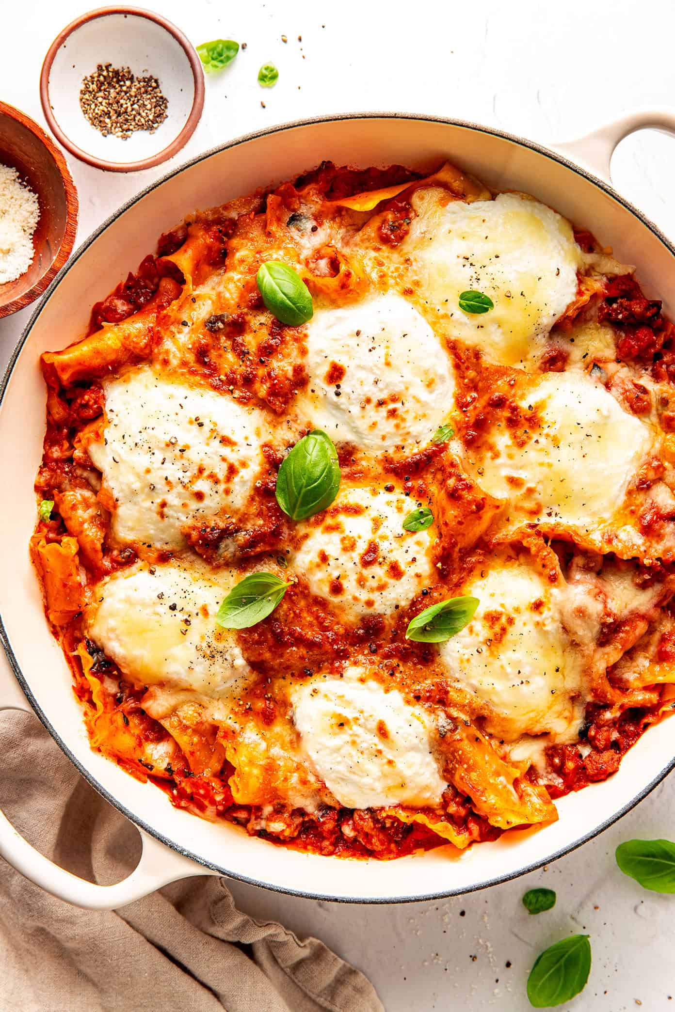 This skillet lasagna recipe delivers all the cozy, saucy, cheesy vibes of classic lasagna — without the multiple-hours-of-prep and layering commitment.