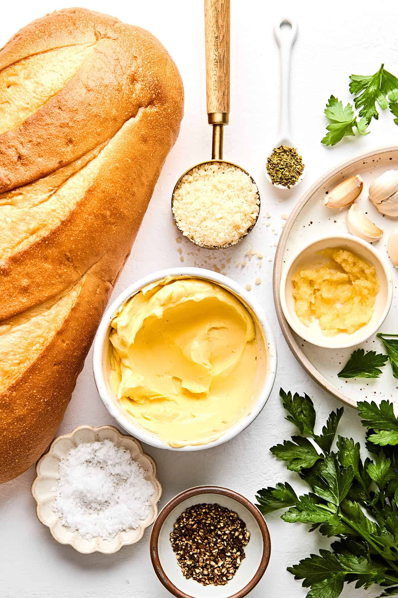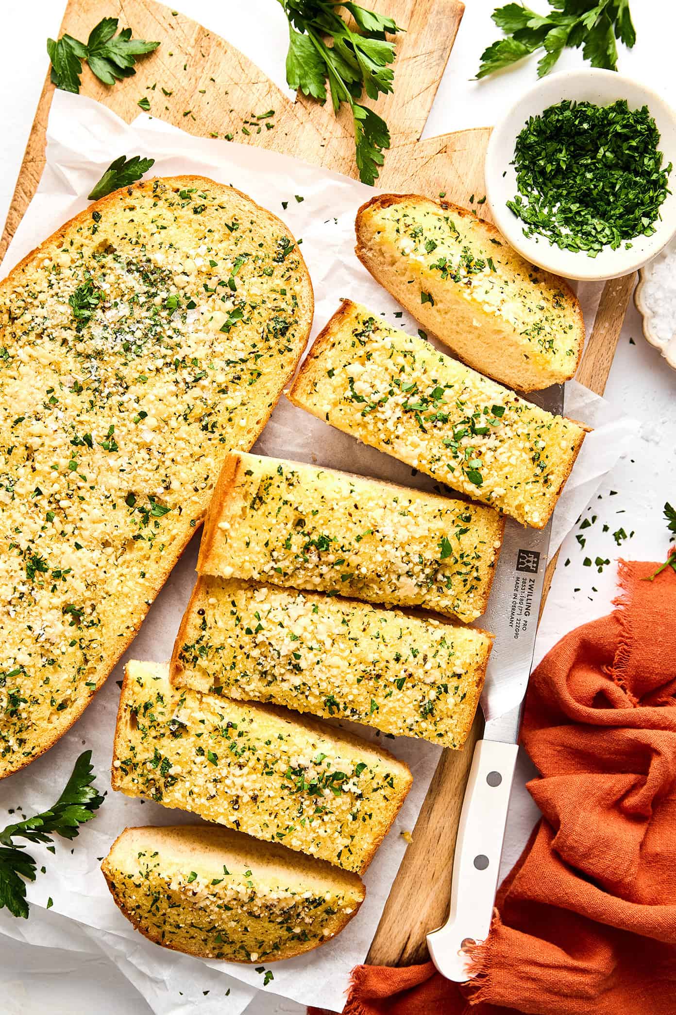 A soft Italian or French loaf works best here โ something with a slightly chewy interior and not too tough of a crust so the butter can really soak in. Baguettes work too, just keep an eye on bake time since theyโre thinner.
