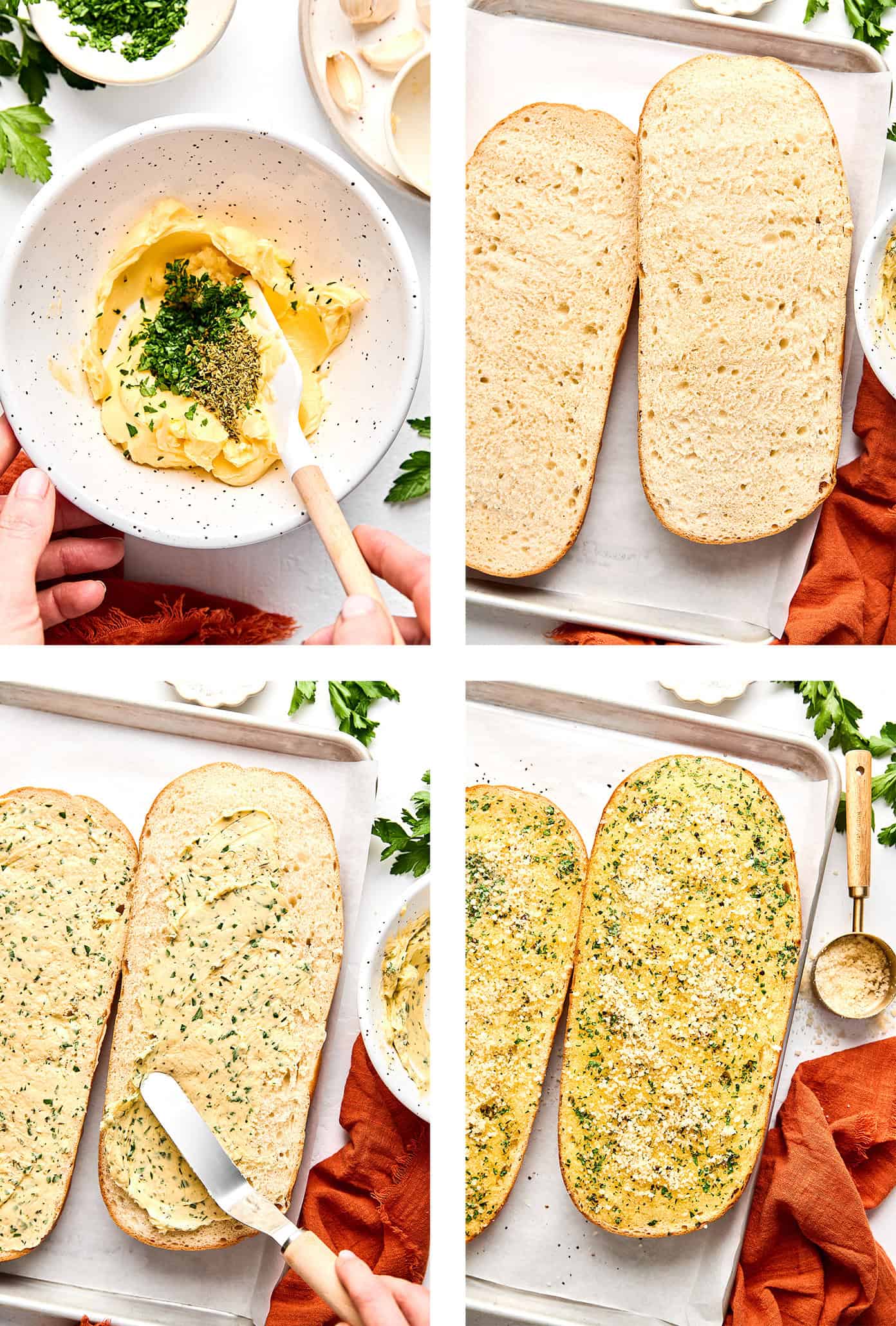 - Mix the garlic butter. In a small mixing bowl, stir together the softened butter, grated garlic, parsley, and oregano until smooth and well combined. Spread the butter mixture evenly over both halves of bread. Sprinkle evenly with the flaky sea salt and coarsely-ground black pepper.