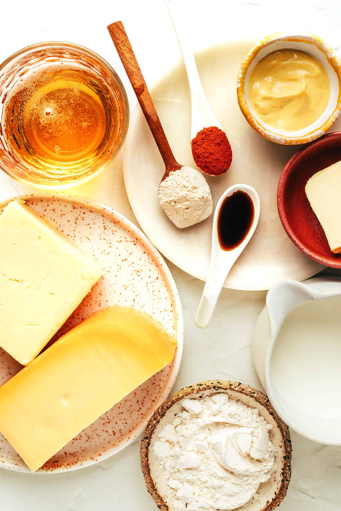 - Shredded cheese:ย I like to use a 50/50 mix of smoked gouda and sharp cheddar for a delicious balance of rich, smoky, salty flavors. But feel free to use any kinds of melting cheeses that you love best here. (Cheddar, Gouda, Gruyรจre, Fontina, Havarti and Monterrey Jack are all great options!) For the smoothest texture, skip the pre-shredded cheeses (which often contain anti-clumping additives) and grate a block of cheese yourself — it makes all the difference when creating a velvety sauce.