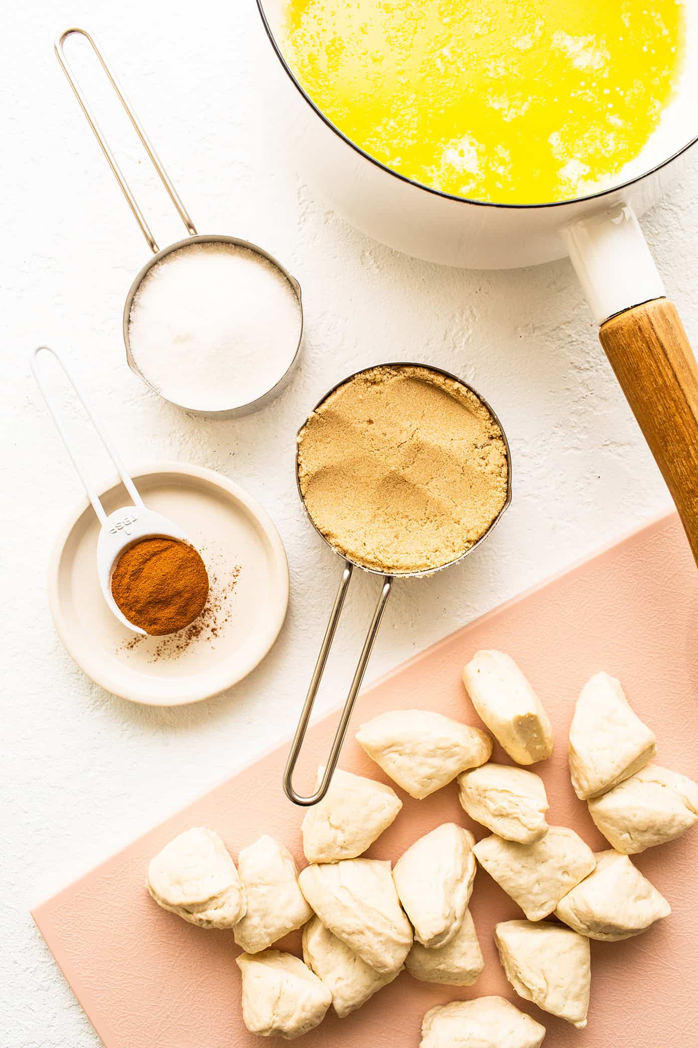 - Sugars: We’ll use white granulated sugar here to create a yummy cinnamon-sugar mix to dip the biscuit pieces, plus brown sugar to melt into our butter sauce.