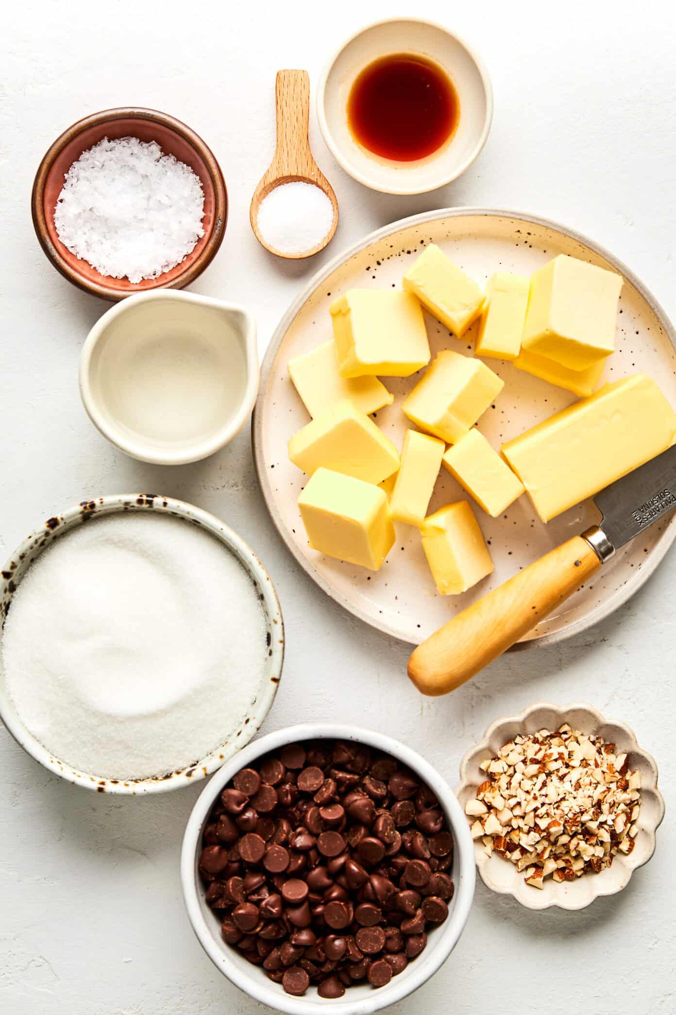 If youโre new to toffee making, I definitely recommend using a candy thermometer to help everything cook to the proper temperatures. Iโve also included lots of tips below to ensure the process goes smoothly. It’s not difficult, and all you need are a few simple ingredients to make it happen. So let’s do it!