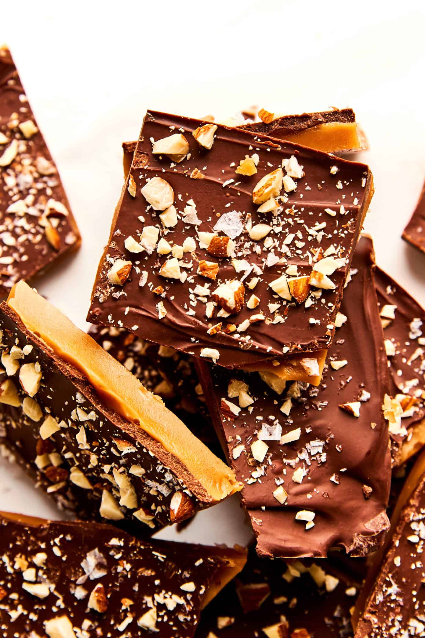 After making lots of toffee over the years, this is the recipe Iโve happily landed on as my personal favorite. It starts with a simple buttery toffee base, gets topped with chocolate chips that melt into a glossy layer, and finishes with a sprinkle of nuts (totally optional) and flaky sea salt. And I have to say โ one of my favorite things about this version is that it doesn’t stick to your teeth!