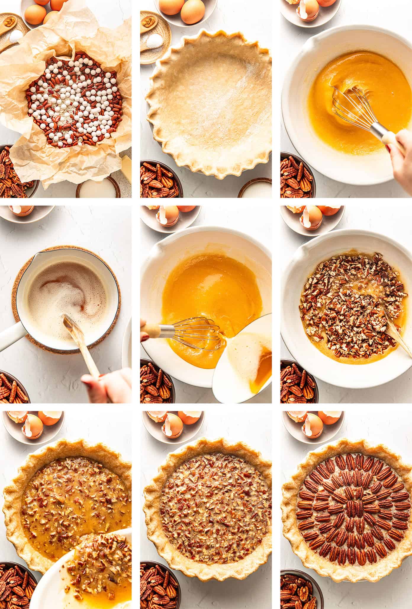 Assemble. Pour the filling into the blind-baked crust. Arrange the remaining 2 cups of pecan halves decoratively on top.