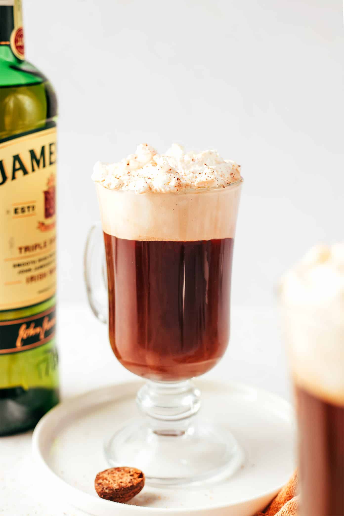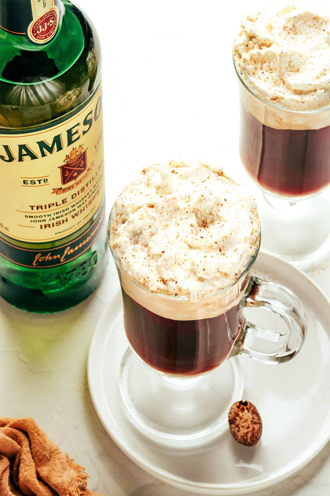 - Optional toppings: I also love adding some freshly-grated nutmeg or chocolate shavings on top of Irish coffee. Just grab a Microplane (or another fine grater) and either a whole nutmeg or chocolate bar and sprinkle some shavings on top of the whipped cream.