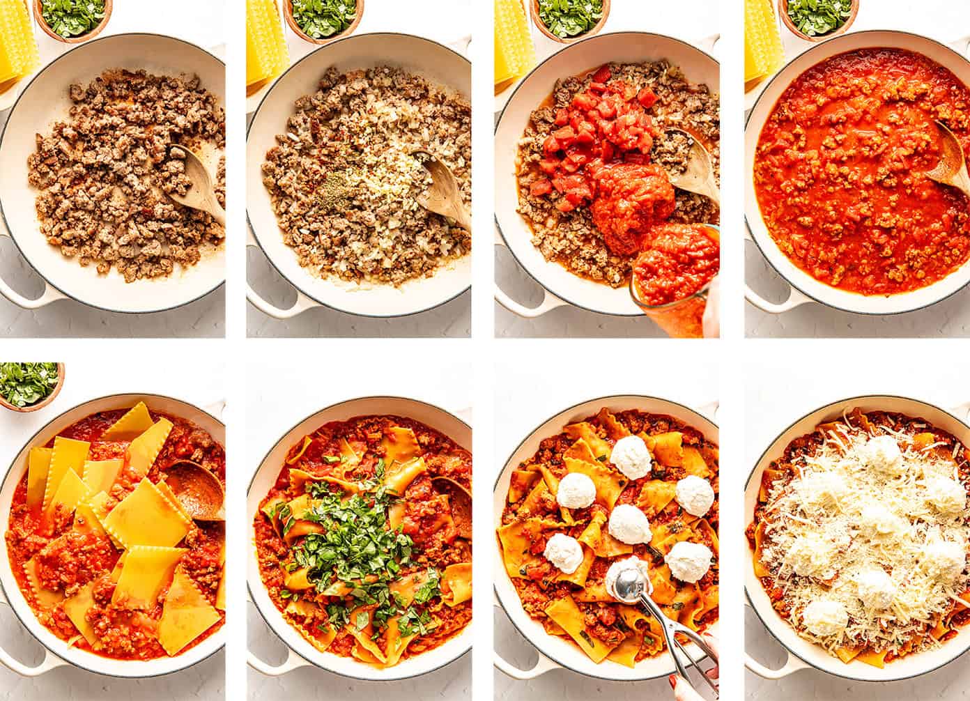 It delivers all the cozy, saucy, cheesy vibes of classic lasagna โ without the multiple-hours-of-prep and layering commitment. Everything cooks together in one pan, the noodles soak up a perfectly flavorful tomato sauce, and itโs all finished with generous scoops of ricotta and plenty of melty cheese.
