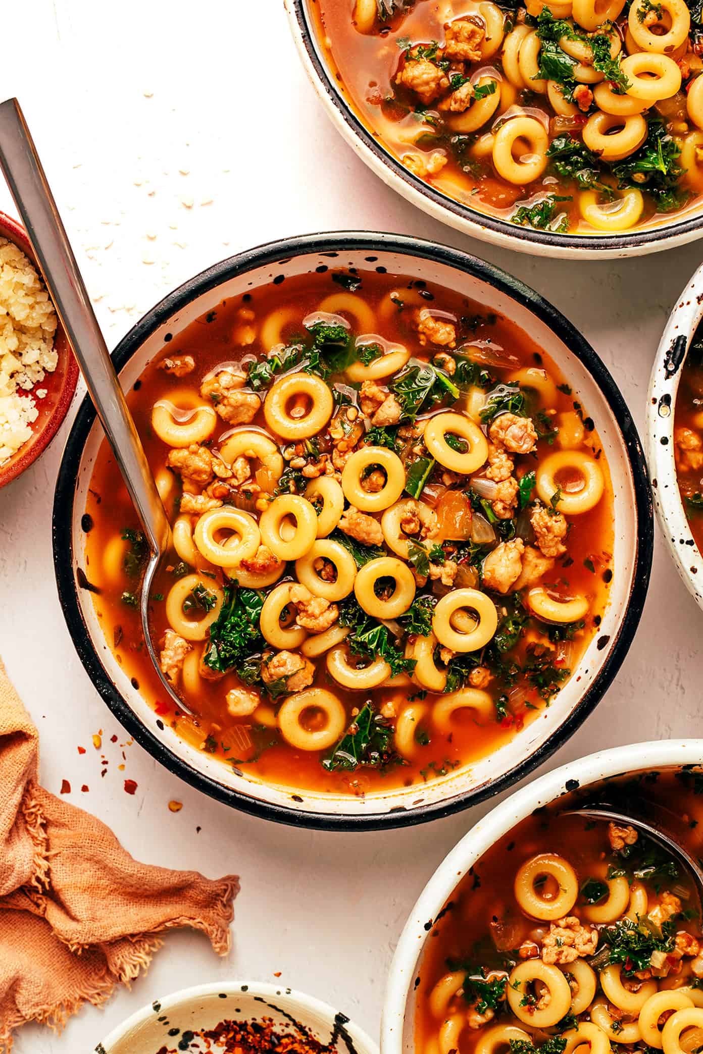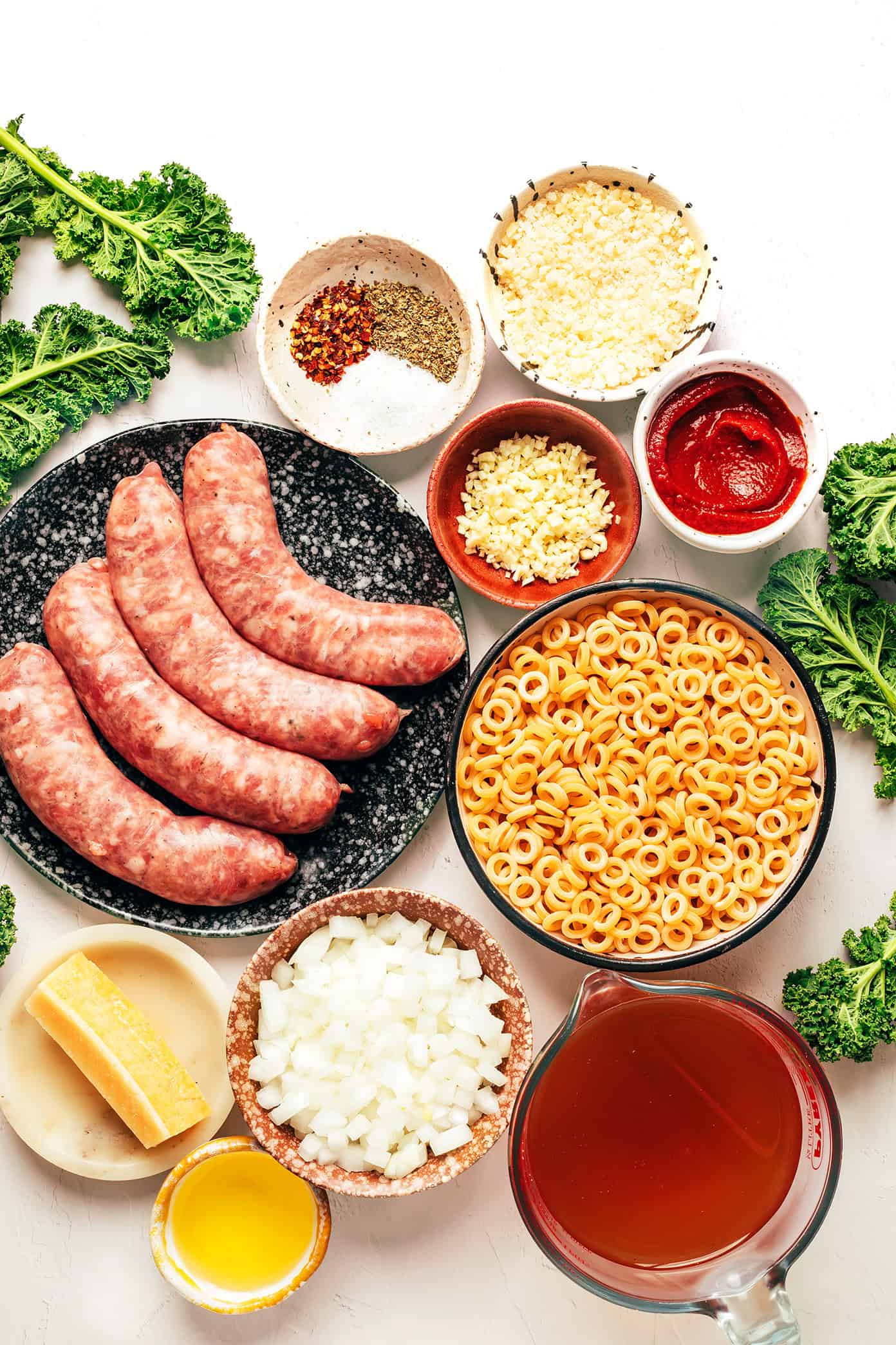 Itโs super easy to make in around 30 minutes with a simple list of ingredients, and somehow tastes like so much more than the sum of its parts. The magic here is the garlicky Parmesan tomato broth, which stays nice and light but is bursting with zesty flavor. When simmered together with chewy pasta rings, savory Italian sausage, and a hint of kale, every bite of this soup is perfectly balanced and tastes sooo cozy and comforting.