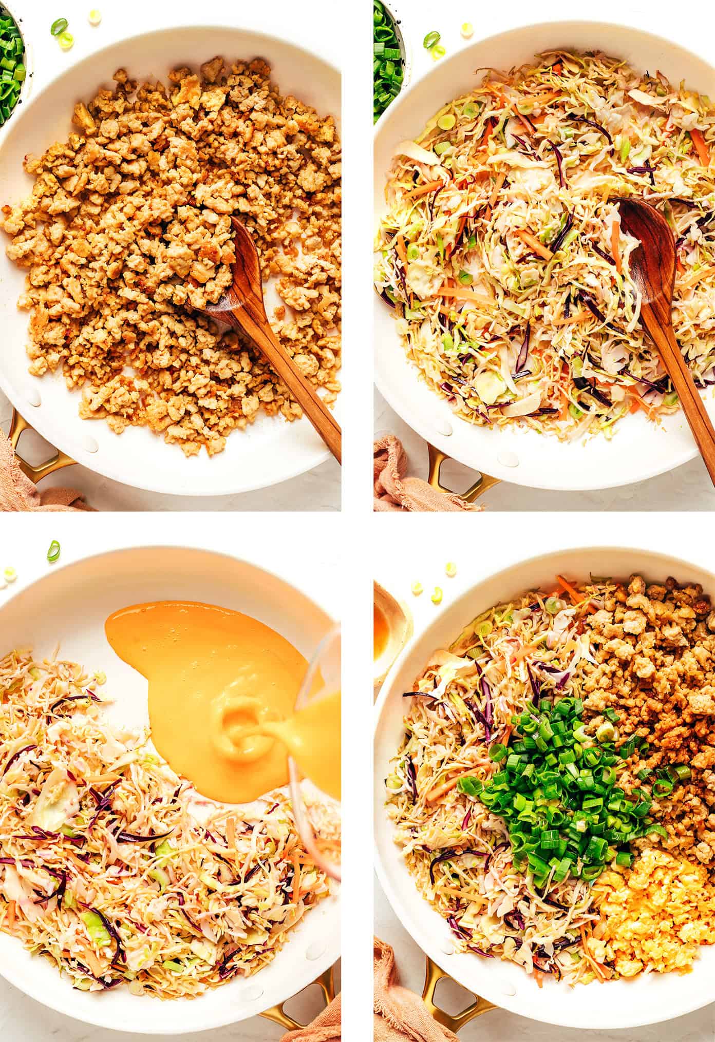 - Scallions: Scallions offer a mild onion flavor and nice crunch that brightens the dish. We’ll saute the white parts with the cole slaw and add the green parts at the end for texture.