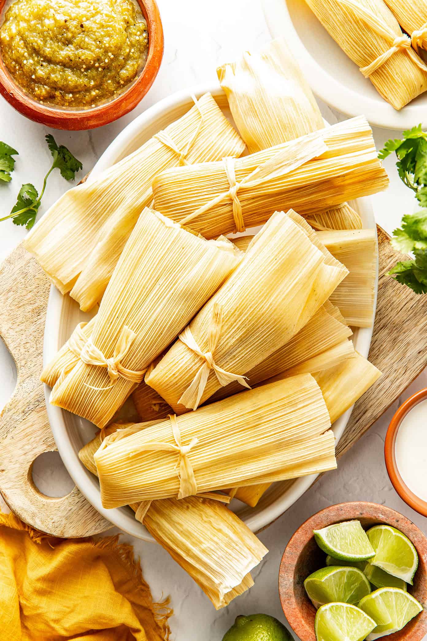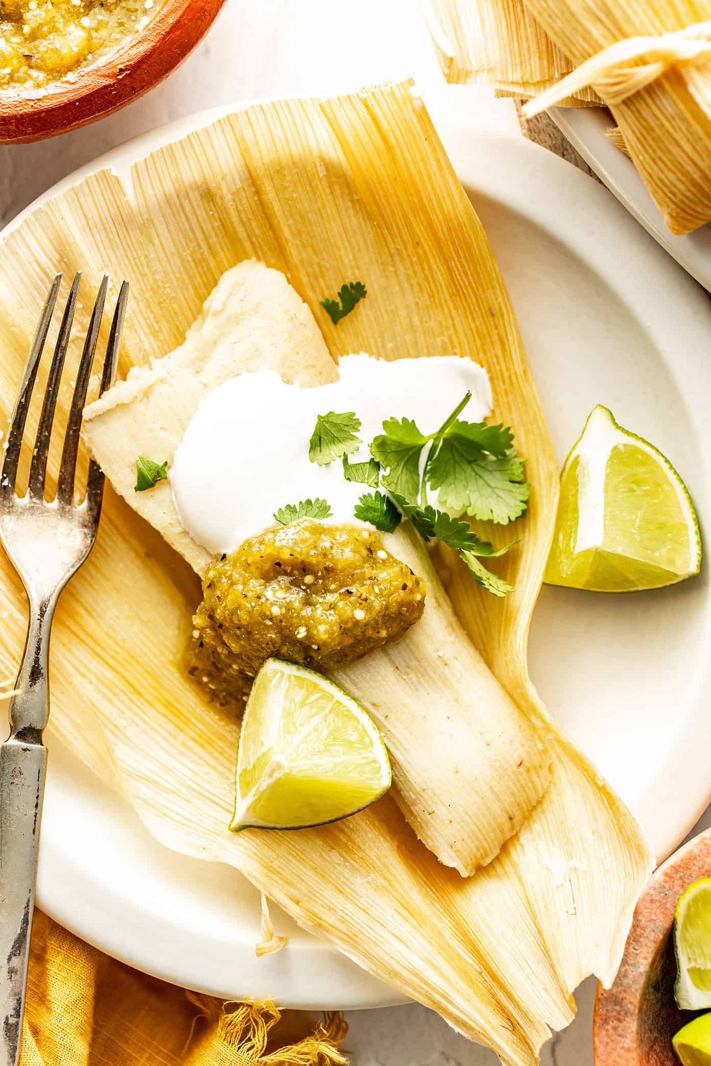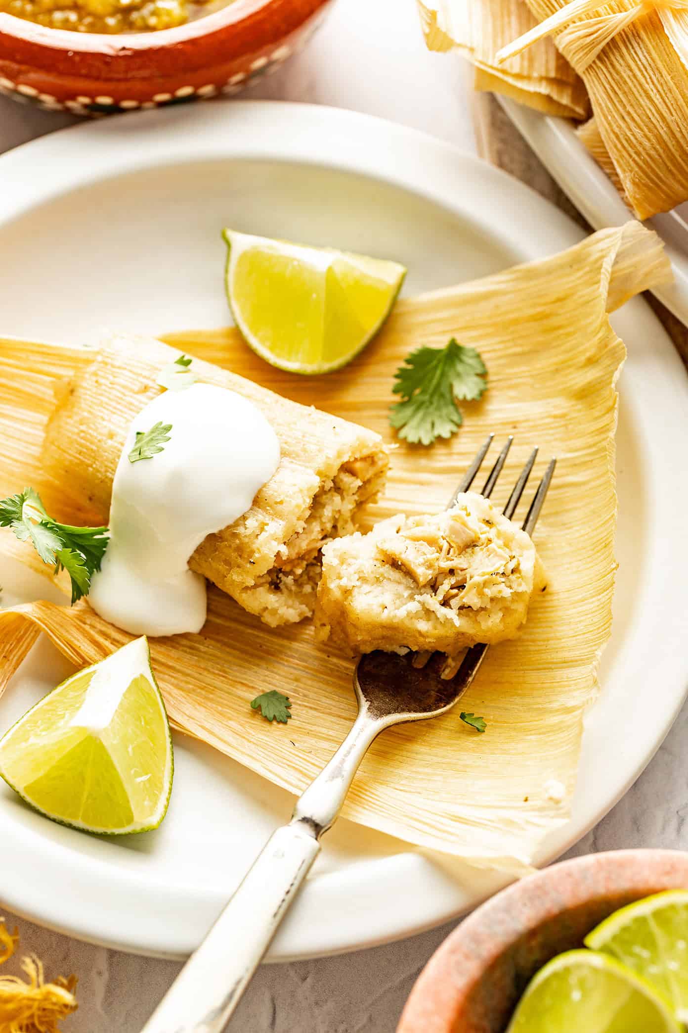 This recipe is built around a few easy shortcuts, starting with shredded rotisserie chicken and tossing it with my favorite quick salsa verde (or you can use store-bought). That way, you can focus your energy where it really matters โ making perfectly fluffy masa and assembling the tamales!